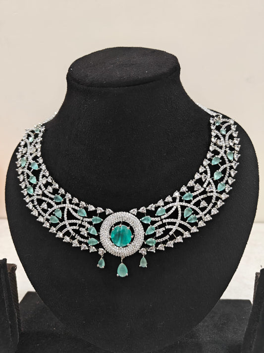 Silver Plated Emerald Green & AD Necklace Set – Bridal & Festive Jewellery