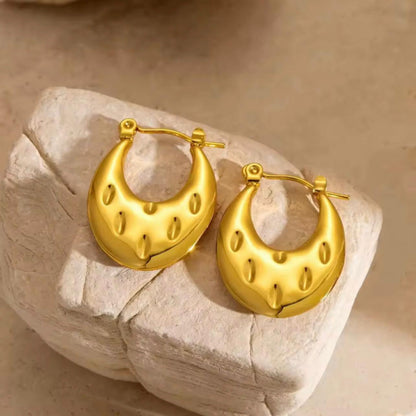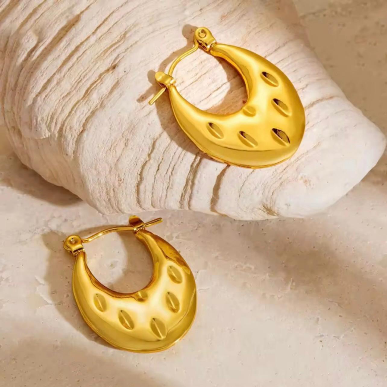Add a bold twist to your everyday style with our 18K Gold Plated Crescent Hoop Earrings, featuring a modern crescent silhouette with subtle embossed detailing. These hoops are as durable as they are dazzling.