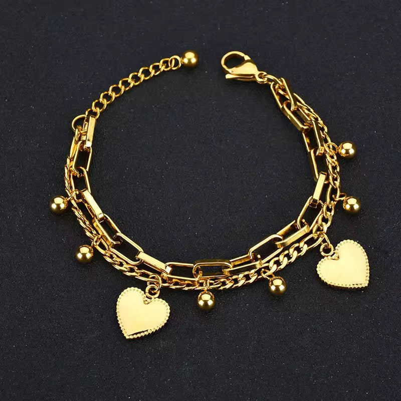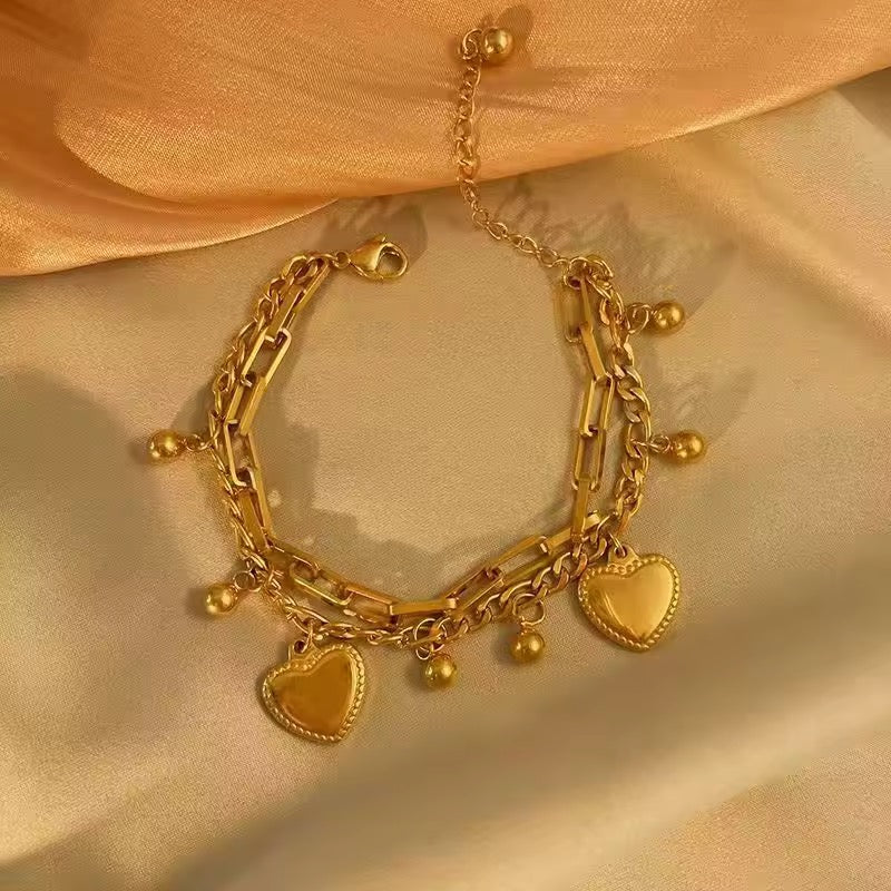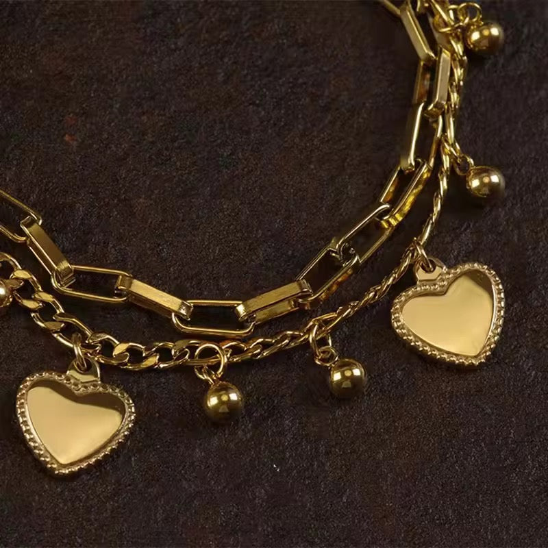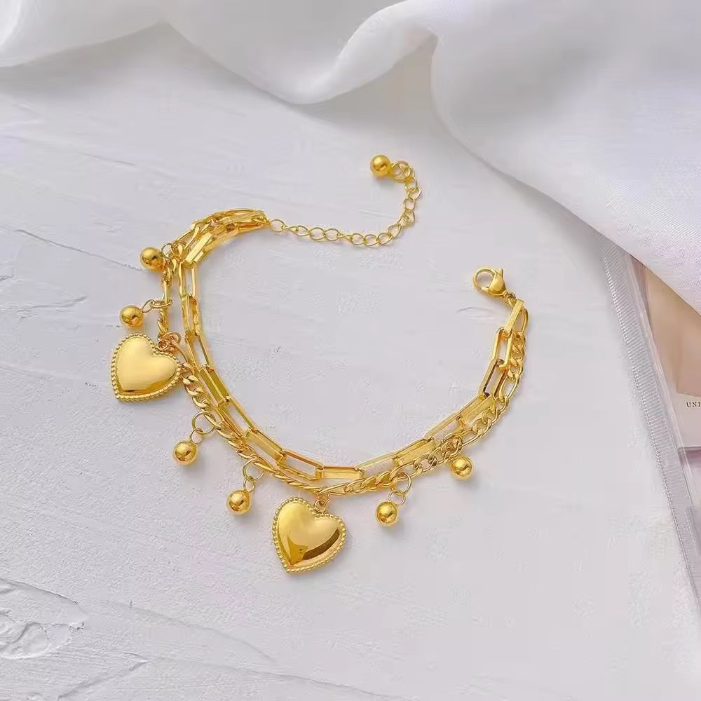 Elevate your style with this elegant 18K gold-plated charm bracelet featuring delicate heart and bead charms. The dual-layer design blends trendy paperclip and classic chain styles, making it a versatile accessory for any occasion. Perfect for daily wear or as a thoughtful gift!