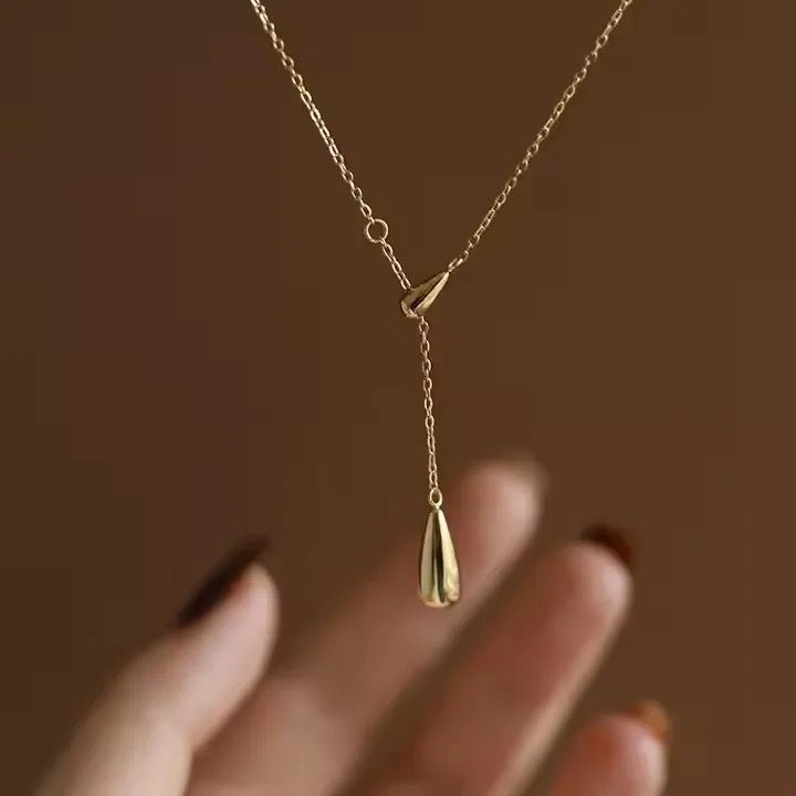 Add a touch of elegance with this simple fashion titanium steel necklace. Featuring a gold-plated water drop pendant and delicate tassels, this piece is perfect for adding a stylish flair to any ensemble.