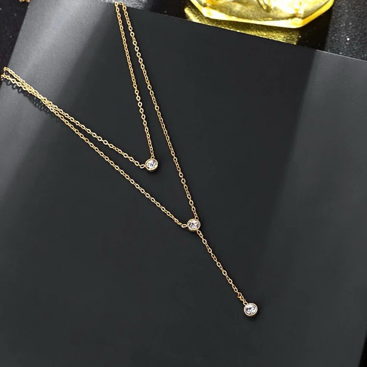 18K PVD Gold Stainless Steel Double Layer Y-Shaped Lariat Necklace with Cubic Zirconia