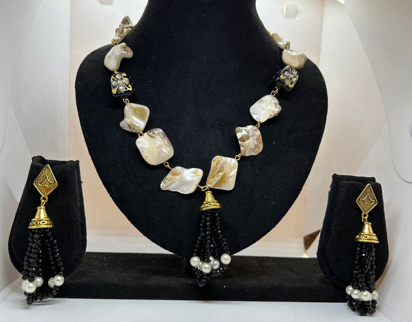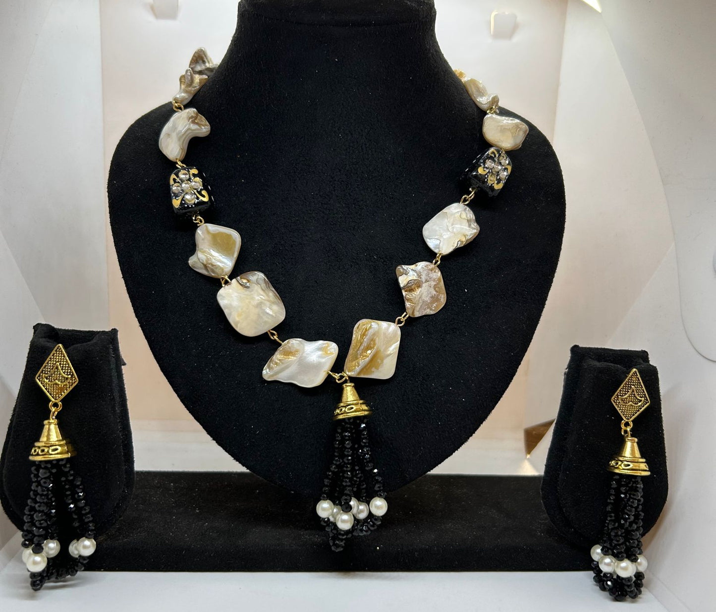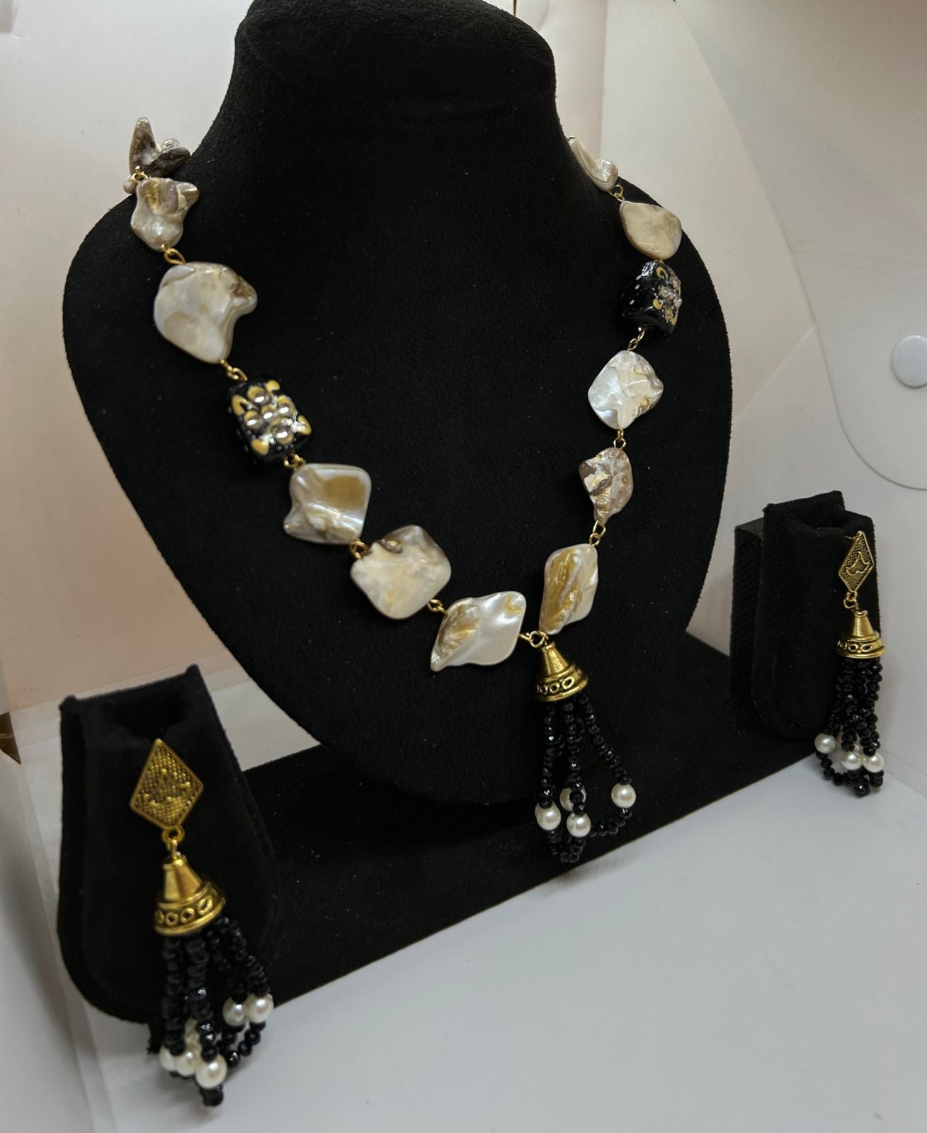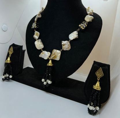 Black and Mother of Pearl Long Necklace Set with Earrings