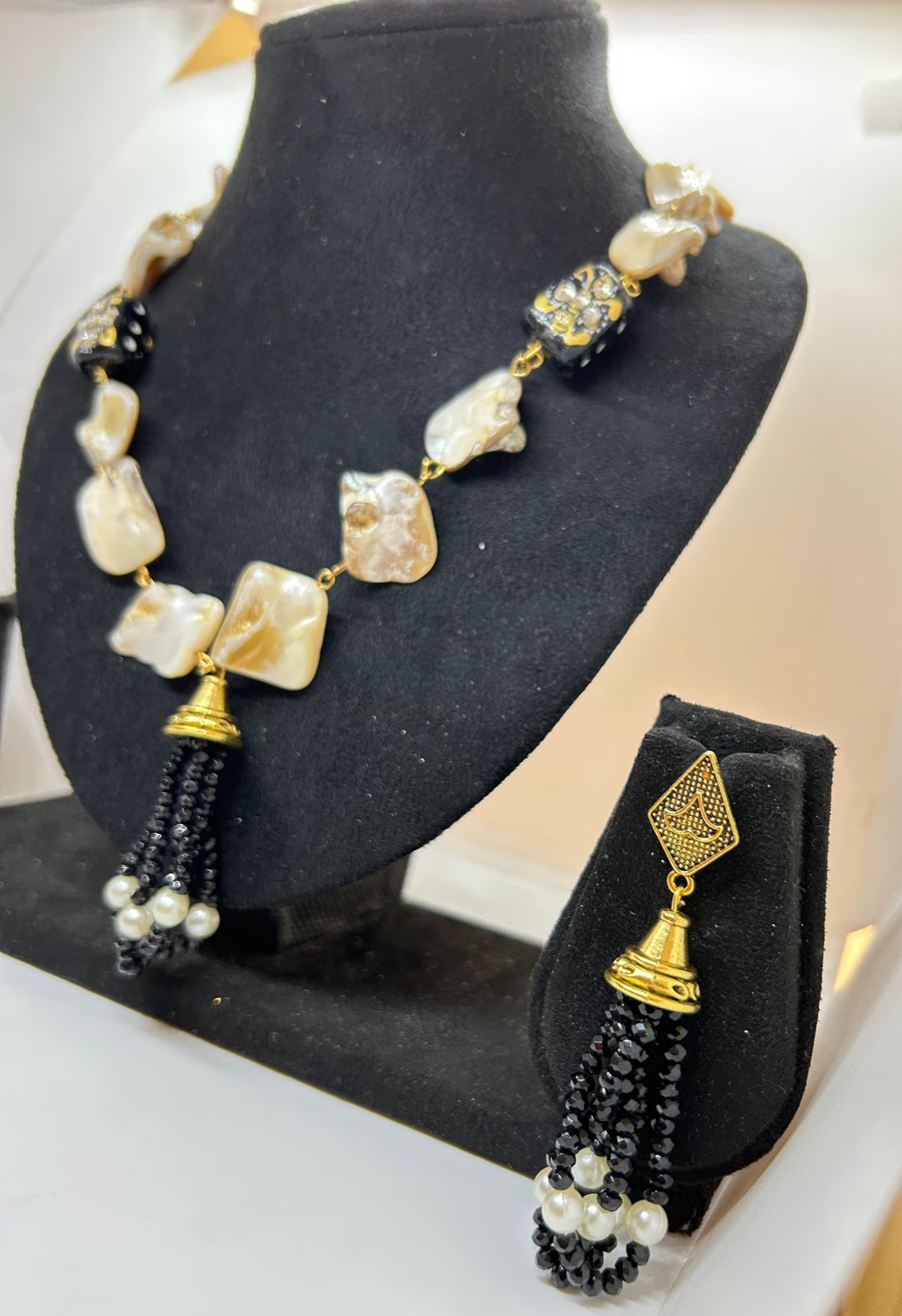 The Black and Mother of Pearl Long Necklace Set with Earrings is a beautiful and stylish jewelry set that combines the natural beauty of mother of pearl with the striking contrast of black beads. This set is perfect for those who want to add a touch of elegance and sophistication to their look.