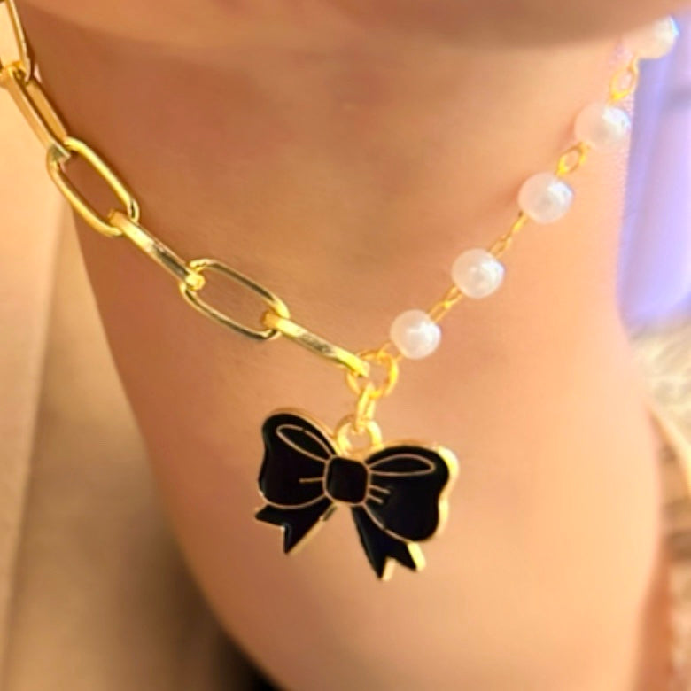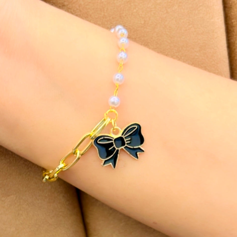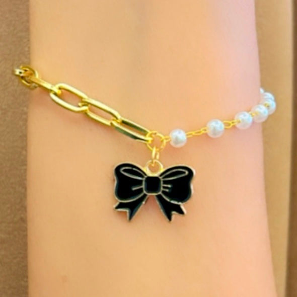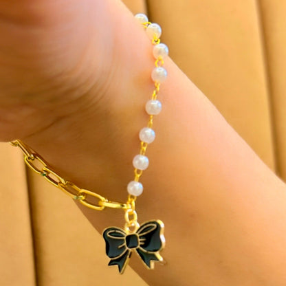 An elegant bracelet featuring a mix of pearl beads and gold chain links, highlighted with a black bow charm, symbolizing serenity and grace.