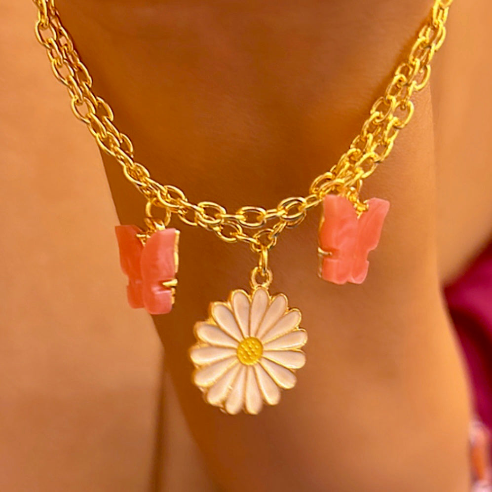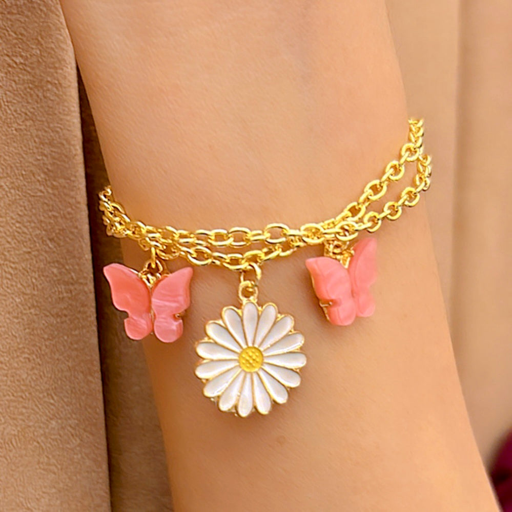 A delicate bracelet featuring two pink butterfly charms and a pristine white daisy charm, perfect for adding a touch of elegance and whimsy to any outfit.