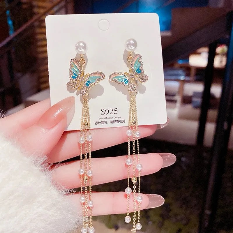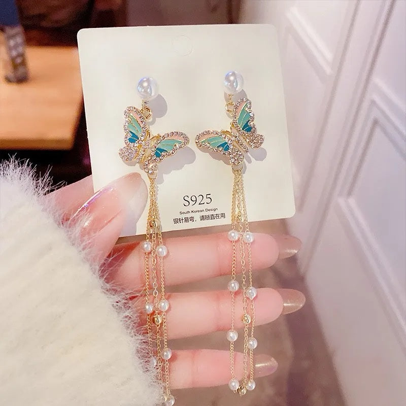 Korean-style versatile earrings featuring exquisite oil painting butterfly designs, rhinestones, metal chains, and pearl tassel long ear hooks. Perfect for adding a touch of elegance to daily wear.