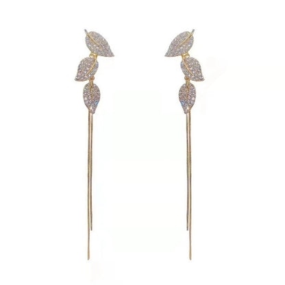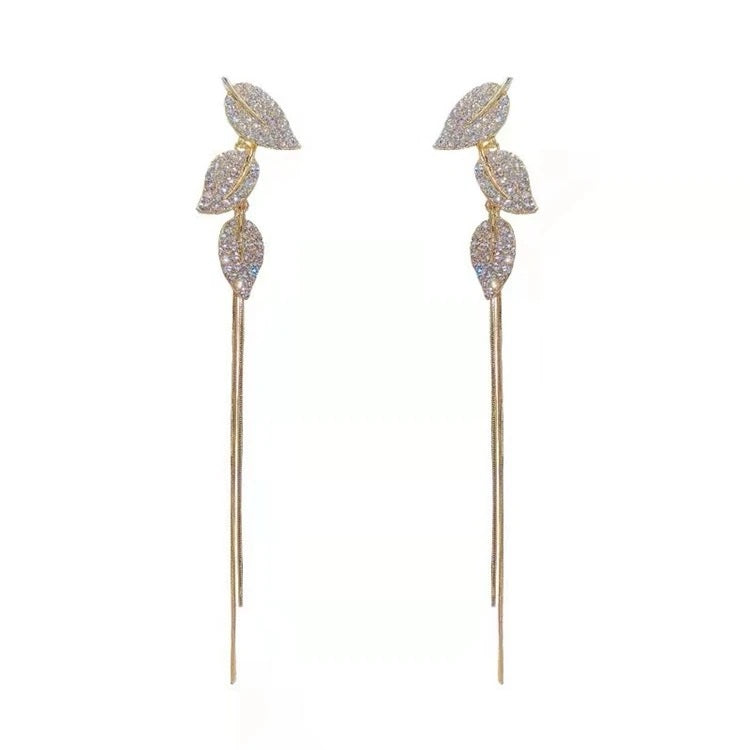 The Elegant Leaf Drop Earrings are a sophisticated accessory featuring a cascading design of sparkling leaves. These earrings showcase three intricately detailed leaves, encrusted with shimmering crystals, gracefully descending in size. The leaves are connected to slender gold strands that add a touch of elegance and movement to the design. Perfect for formal occasions or adding a touch of glamour to any outfit, these earrings are a stunning addition to any jewelry collection.