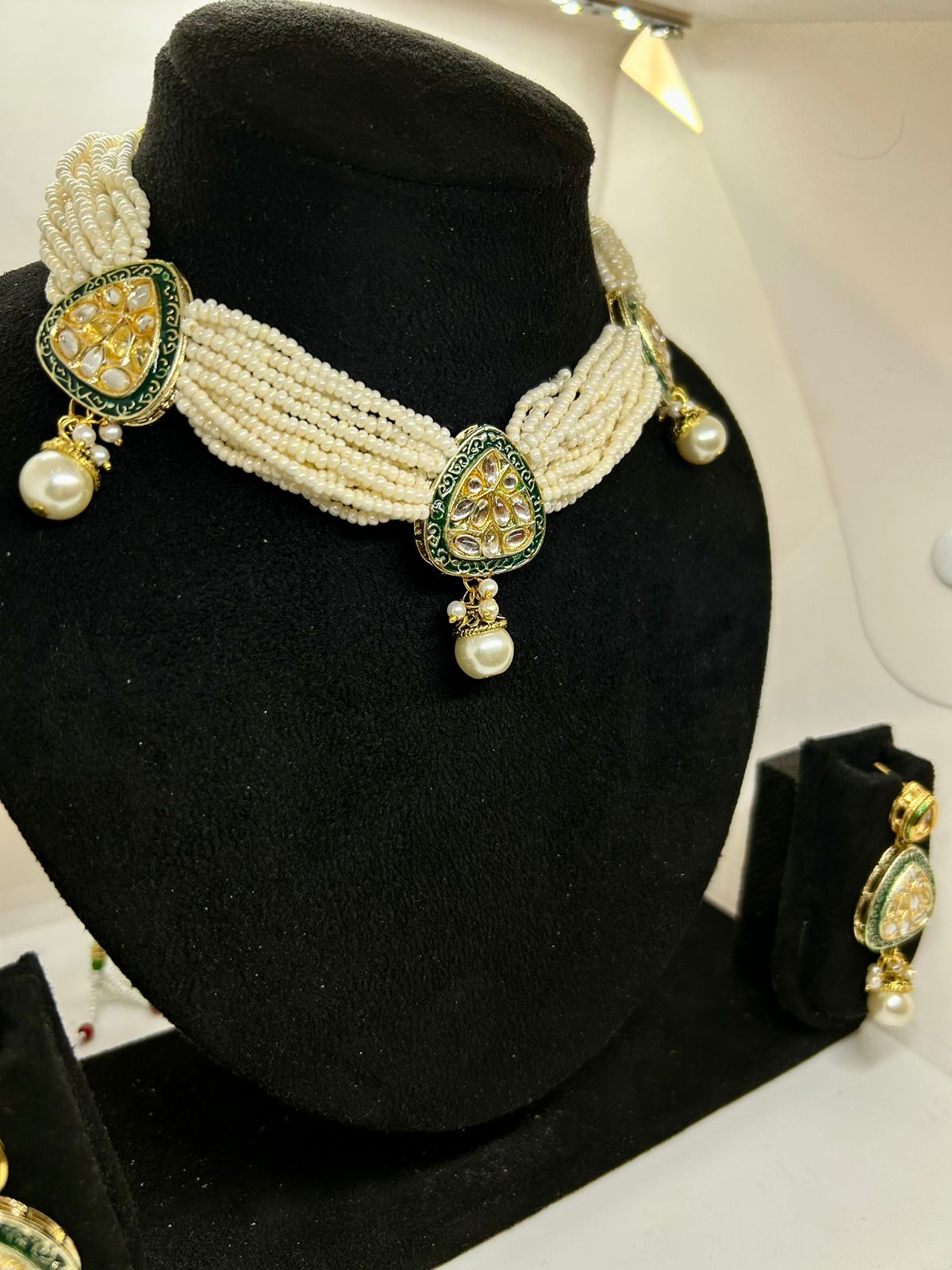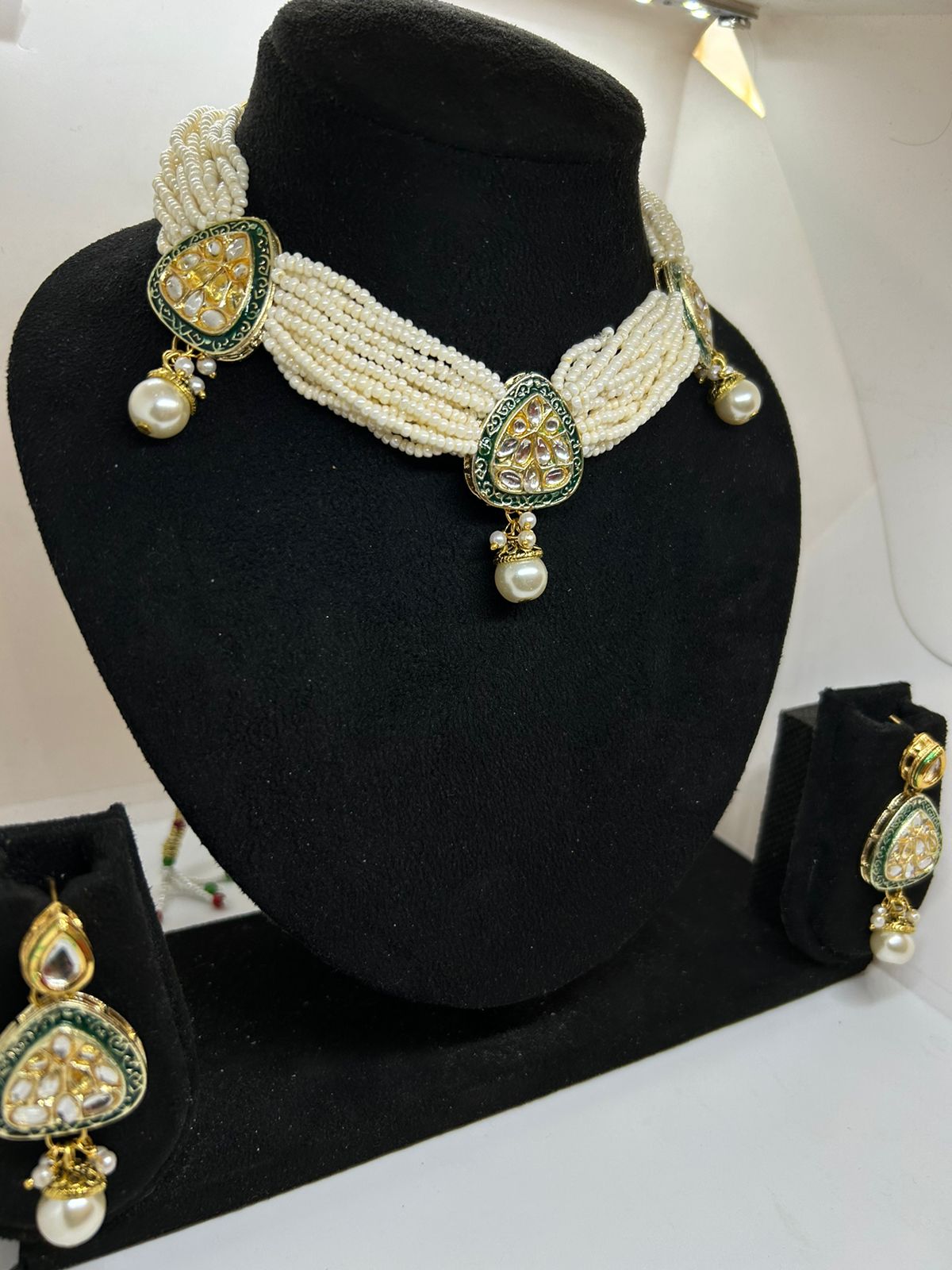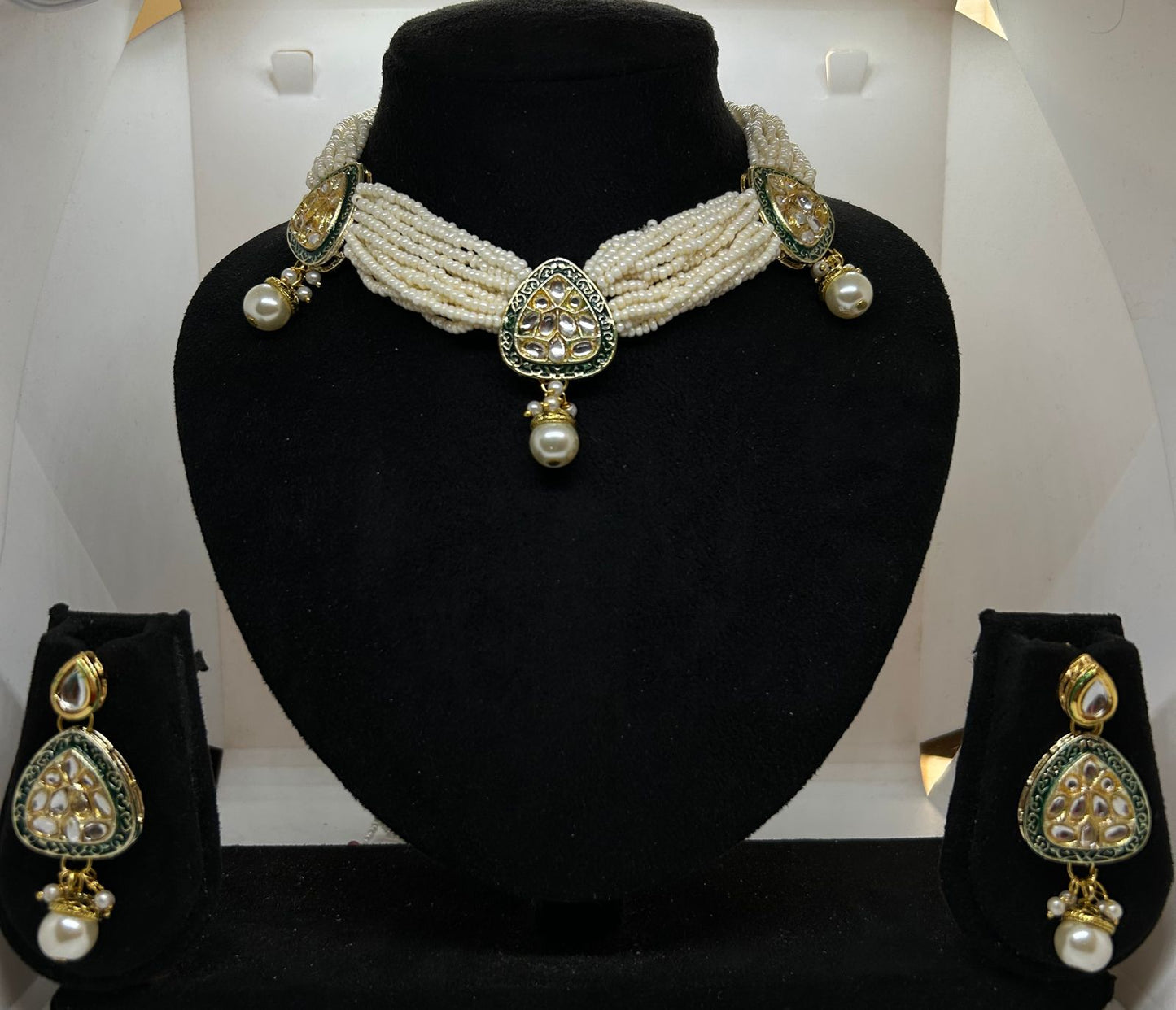 Emerald Dewdrop Kundan and Rice Pearl Necklace with Earrings