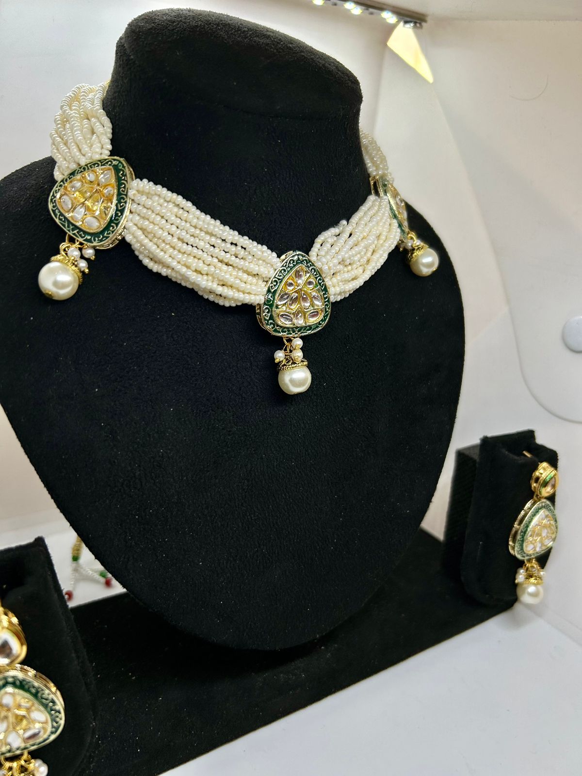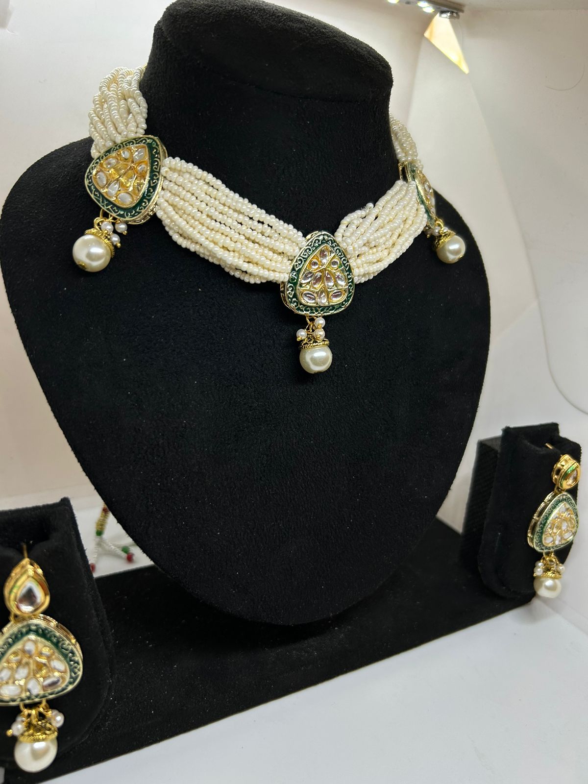 The regal and captivating beauty of this set is sure to leave a lasting impression and make a statement wherever it is worn. The Emerald Dewdrop Kundan and Rice Pearl Necklace with Earrings also makes a thoughtful and meaningful gift for a loved one on a special occasion, such as a wedding, anniversary, or birthday.