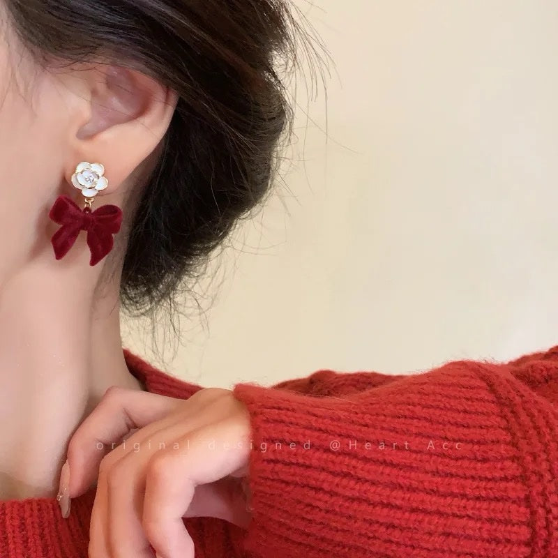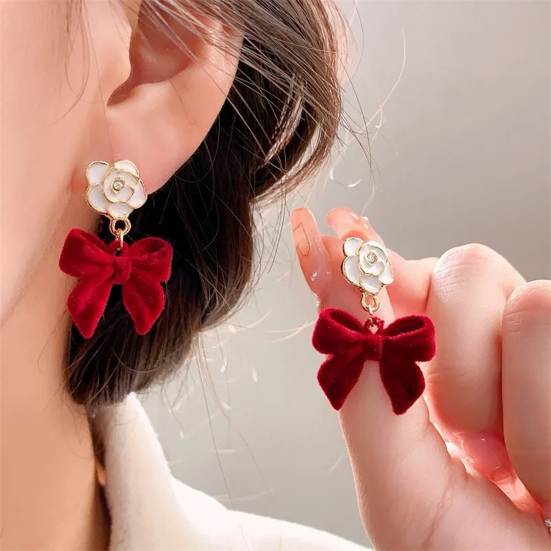 Elevate your style with these charming floral flocking bow stud earrings, featuring a delightful combination of feminine flowers and elegant bows, perfect for adding a touch of whimsy and sophistication to any outfit.