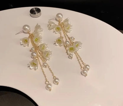 Elegant earrings featuring a floral design with pearls and long tassels, adding a touch of sophistication to your look.