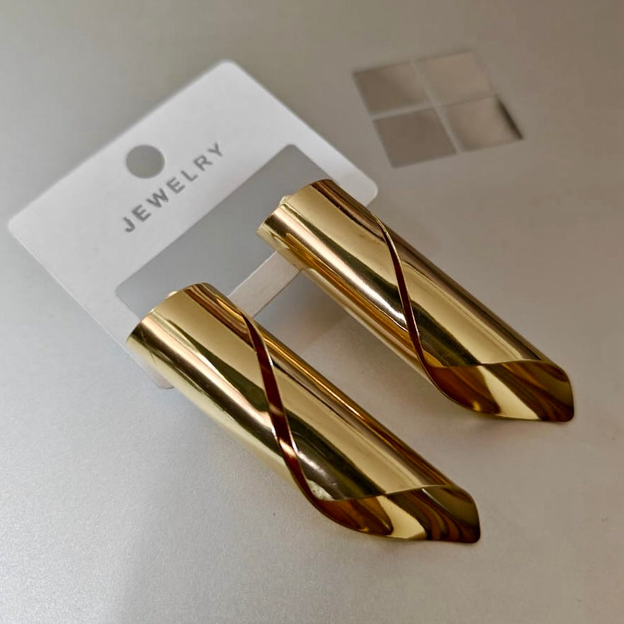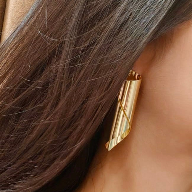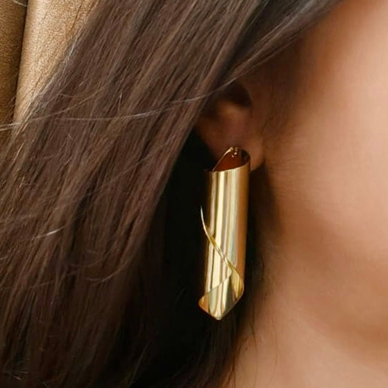 Elevate your accessory game with these chic Gold Twisted Cylinder Earrings. Featuring a unique cylindrical shape with a subtle twist design, these earrings add a touch of modern elegance to any outfit. Crafted from high-quality gold-plated material, they offer a luxurious shine and durability. Lightweight and comfortable, these earrings are perfect for both everyday wear and special occasions. Make a bold statement and showcase your sophisticated style with these eye-catching earrings.