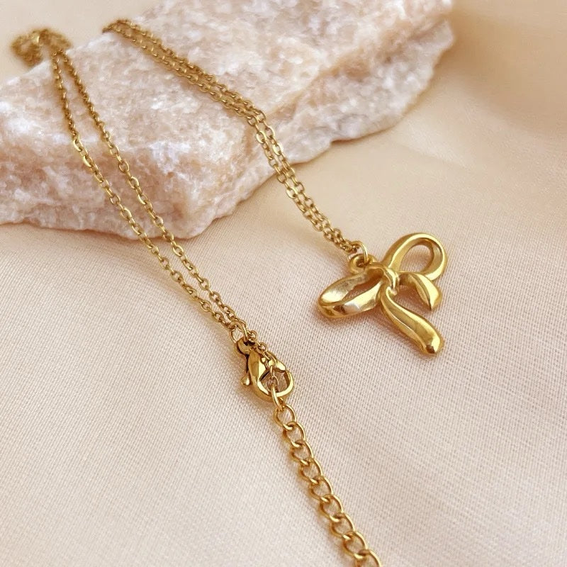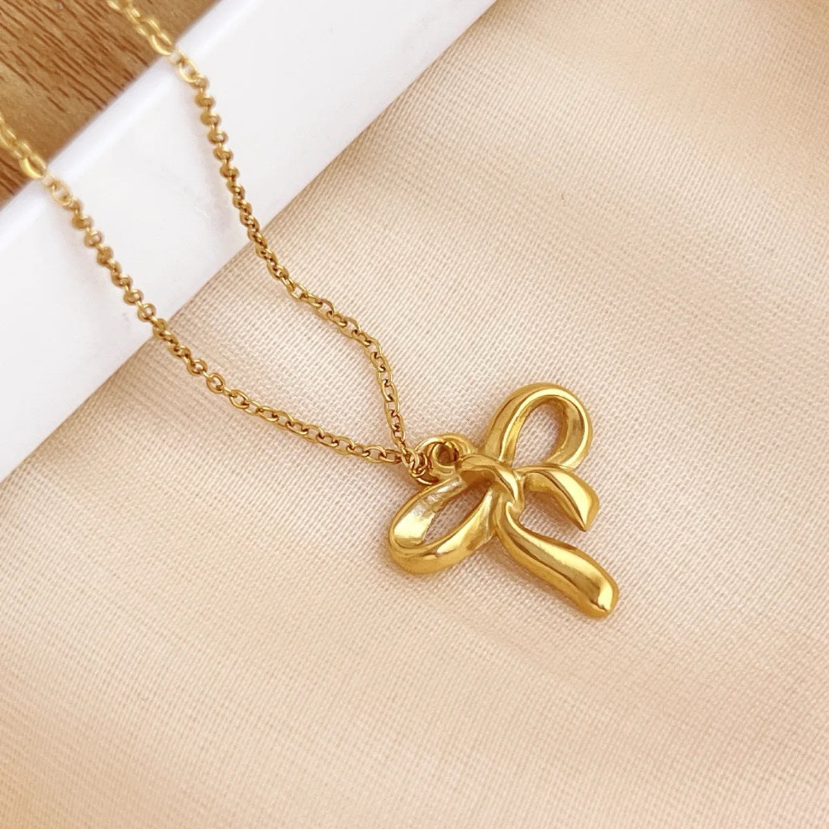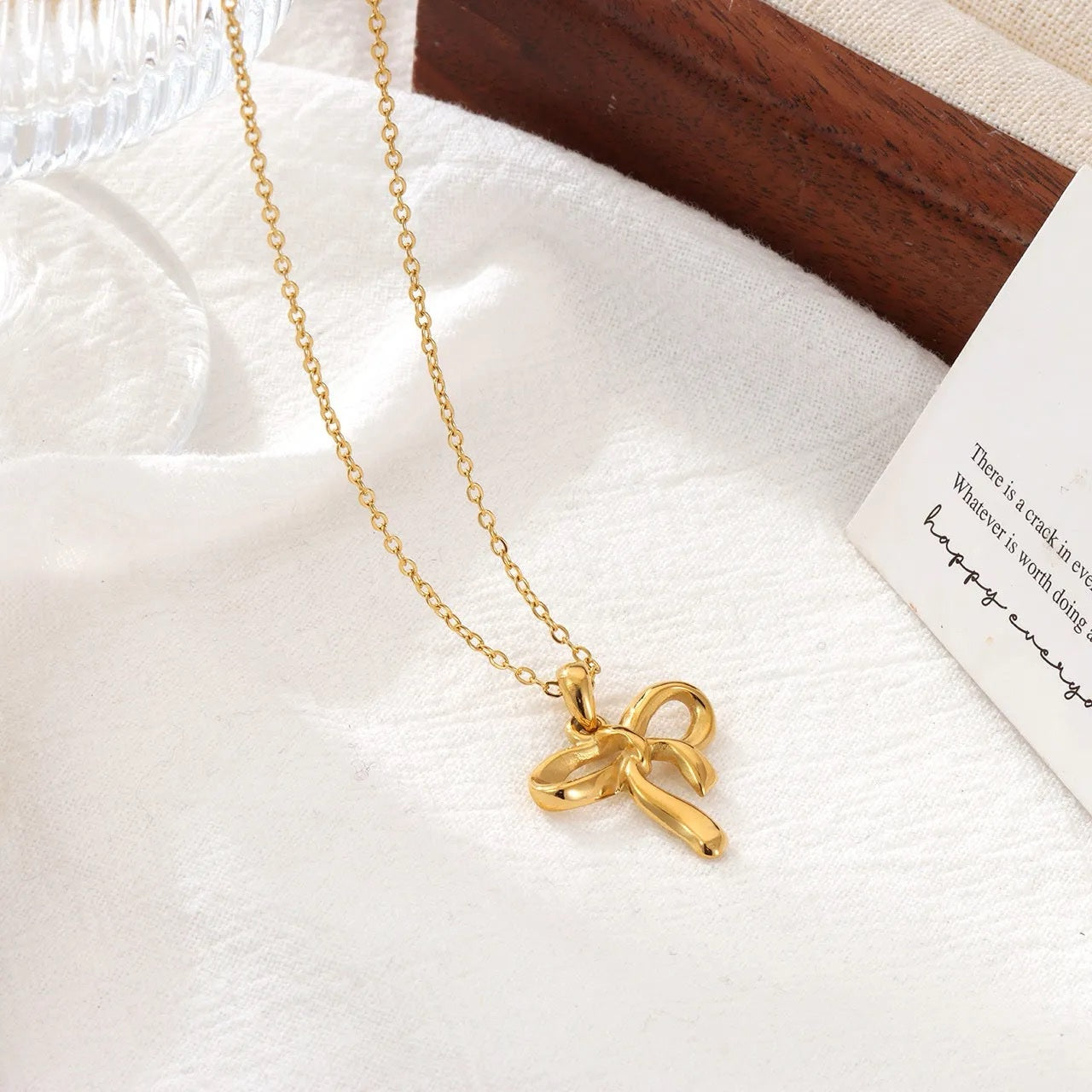 Add a touch of charm to your look with the Simple Bow Necklace, beautifully crafted from stainless steel and plated with 18k gold. This delicate and elegant necklace features a minimalist bow design, symbolizing grace and femininity. Perfect for everyday wear or as a thoughtful gift, the tarnish-resistant gold plating ensures lasting shine and durability. A versatile accessory for any occasion, this bow necklace brings a subtle yet stylish accent to your collection.