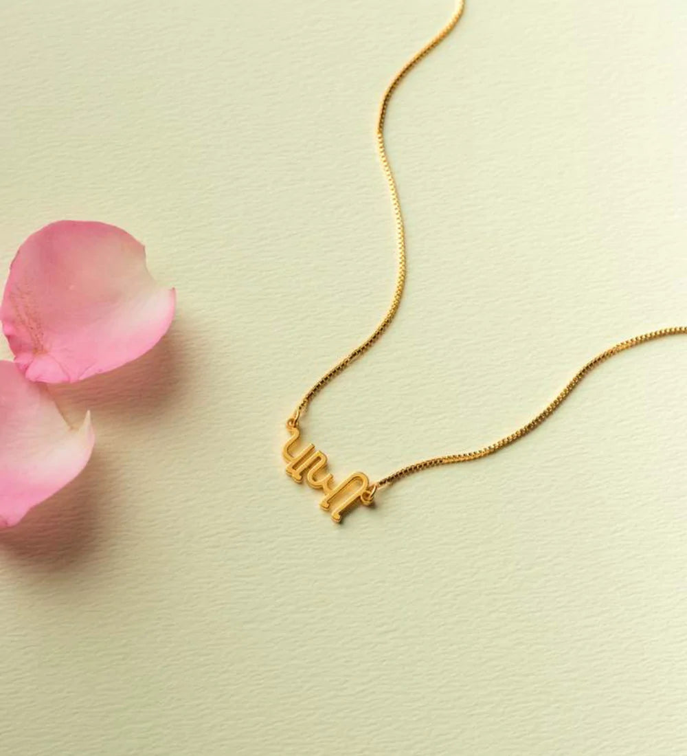 The Gujarati Style Name Necklace is a personalized piece of jewelry that is designed to showcase your name in the elegant Gujarati script font. This unique font style draws inspiration from traditional Indian design elements and aesthetics. The centerpiece of the necklace is a beautiful script font that showcases your name or word of choice in the Gujarati language. This font style adds an extra touch of elegance and sophistication to the necklace. A Gujarati Style Name Necklace is a thoughtful and meaningful gift for a loved one or friend. It can be worn alone as a statement piece or paired with other necklaces for a layered look. By wearing this necklace, you can showcase your identity and cultural heritage in a stylish and elegant way. In essence, a Gujarati Style Name Necklace offers a personalized and culturally significant touch to your jewelry collection. Whether you're seeking a unique piece for yourself or gifting it to someone special, this necklace is sure to be cherished for its personalized and elegant design. This piece is made especially for you and will be shipped within 12-14 working days due to high demand ❤️