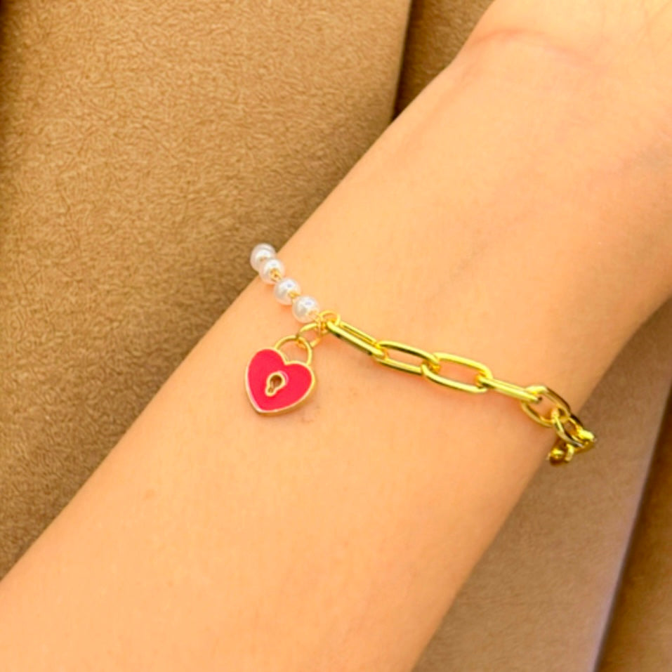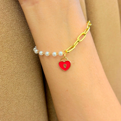 A delicate bracelet featuring a mix of pearl beads and gold chain links, adorned with a red heart-shaped lock charm, symbolizing love and affection.