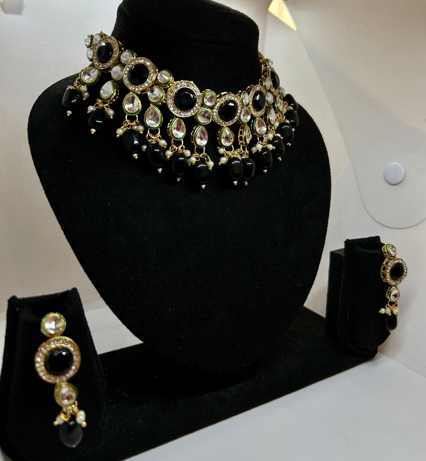 The timeless beauty and intricate design of this set make it a perfect gift for a loved one on a special occasion, such as a wedding, anniversary, or birthday. The Majestic Noir Kundan Necklace Set with Earrings is a beautiful addition to any jewelry collection and is sure to leave a lasting impression wherever it is worn.