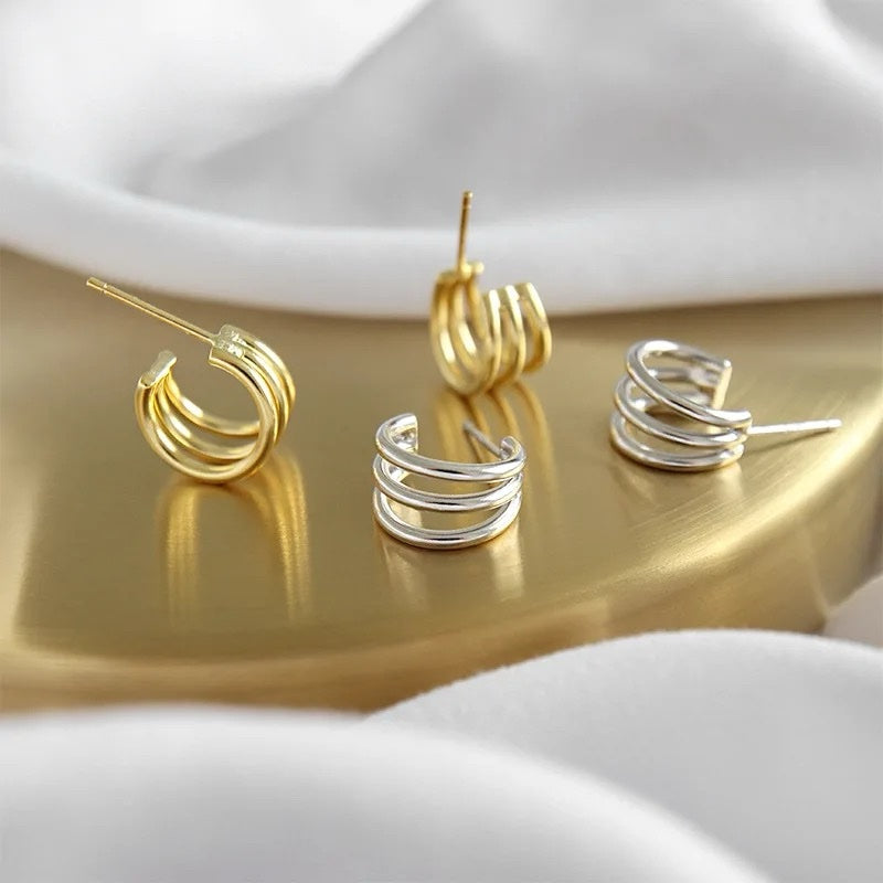 Add a subtle touch of elegance to your look with these small silver triple circle earrings, featuring a delicate design that exudes modern sophistication, perfect for effortlessly elevating any outfit with understated charm.