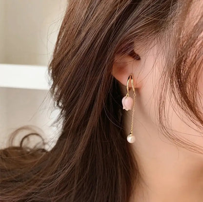 Stylish long earrings featuring pink tulip designs, adding a floral and elegant touch to your ensemble.