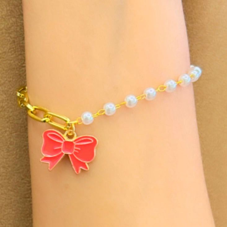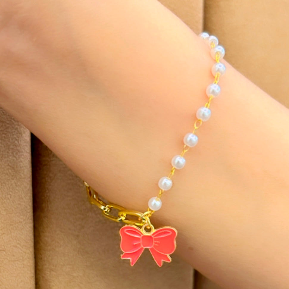 A vibrant bracelet combining pearl beads and gold chain links, adorned with a red bow charm, symbolizing passion and celebration.