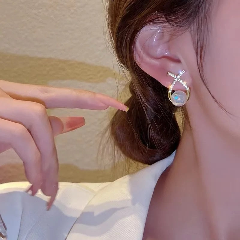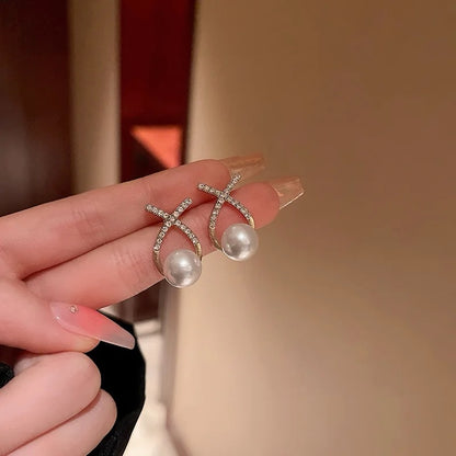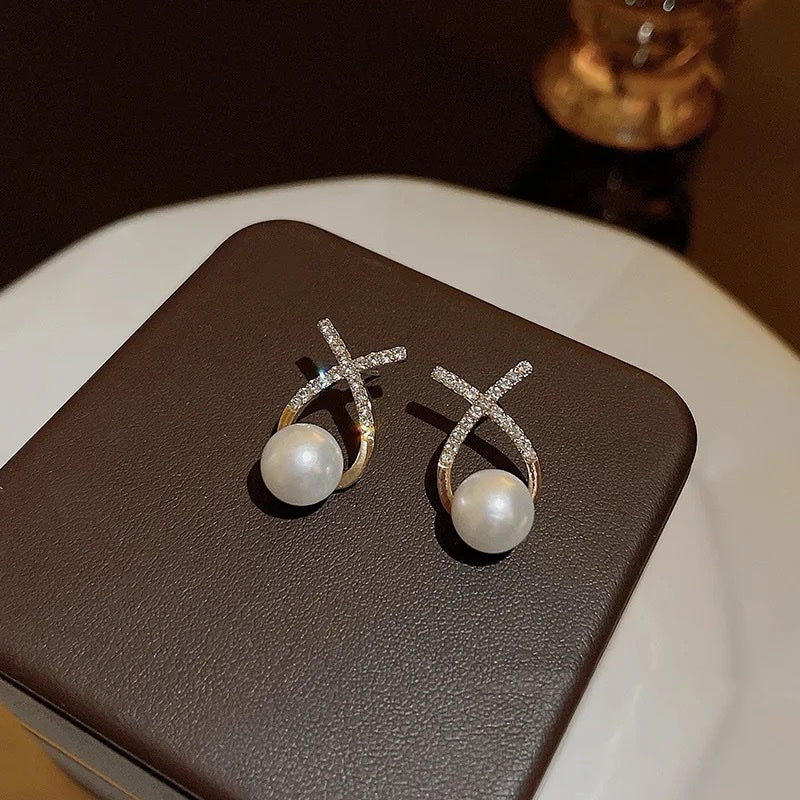 Elegant stud earrings featuring a chic design with crossed rhinestones and faux pearls, perfect for adding a touch of sophistication to any outfit.