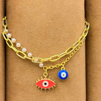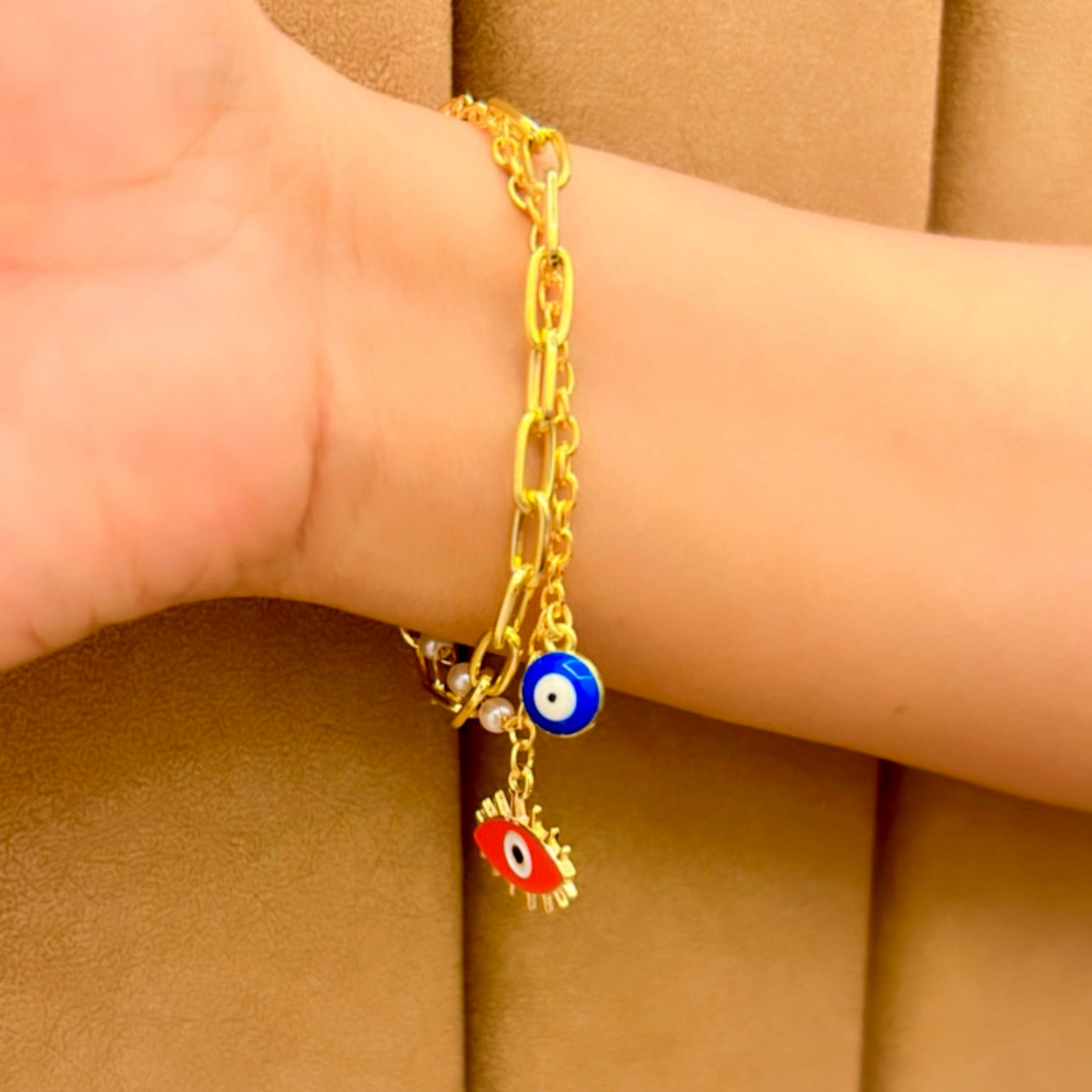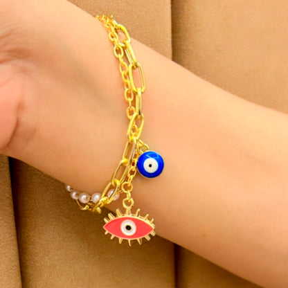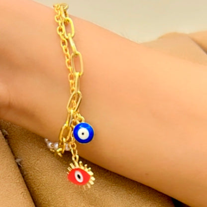 Infuse a burst of vibrant energy into your style with our Scarlet Serenity Evil Eye Bracelet. This captivating accessory features a bold red eye paired with a soothing blue charm, creating a harmonious and eye-catching combination. The bracelet not only adds a touch of flair to your ensemble but also carries the protective symbolism of the evil eye. Elevate your look with the dynamic contrast of red and blue, making the Scarlet Serenity Evil Eye Bracelet a statement piece that effortlessly blends boldness with tranquility.
