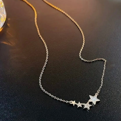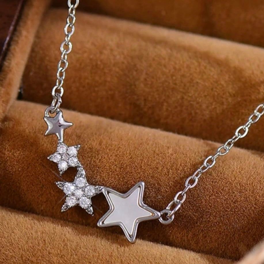 The Silver Celestial Star Necklace is a captivating piece of jewelry featuring a sleek silver chain adorned with a series of delicate stars. This elegant design showcases a combination of solid silver stars and sparkling star charms encrusted with crystals. The centerpiece is a larger star with a subtle hollow design, adding a touch of sophistication to this celestial-inspired accessory. Perfect for both everyday wear and special occasions, this necklace brings a touch of the night sky to your ensemble.