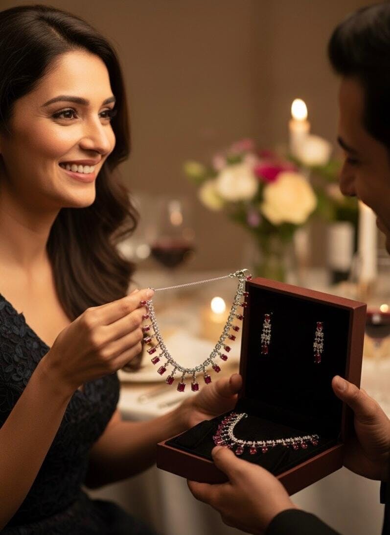 This ruby red necklace set is designed with an elegant arrangement of rectangular ruby stones accentuated by shimmering American Diamonds, making it the perfect blend of modern chic and traditional luxury. The matching statement earrings complete the look, offering a polished touch for weddings, festive wear, cocktail nights, and special occasions.