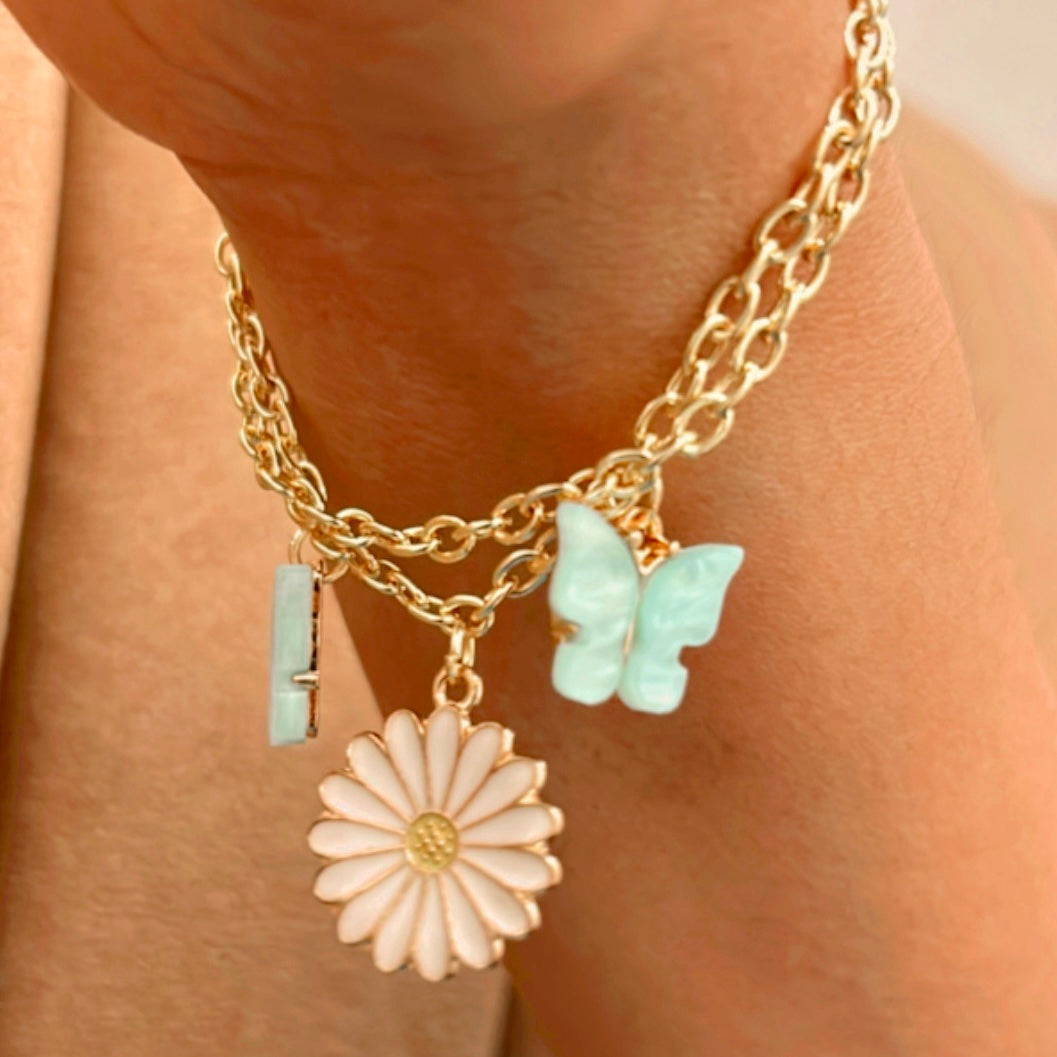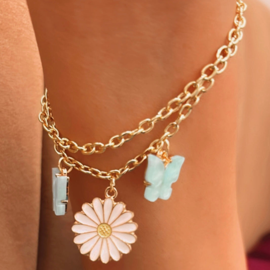 A delightful bracelet adorned with two sky blue butterfly charms and a bright white daisy charm, perfect for adding a touch of serene beauty and elegance to your look.