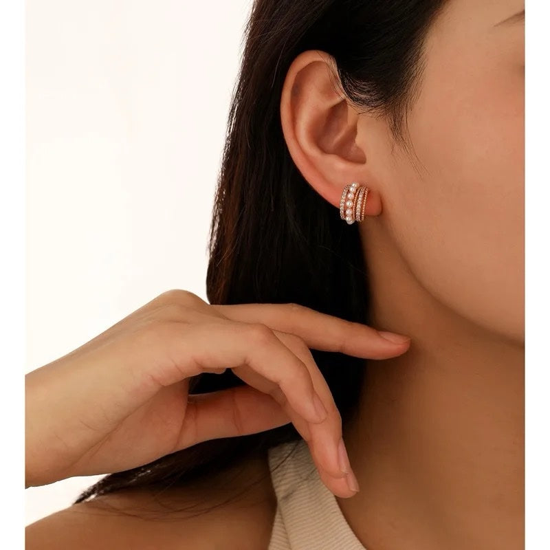 Stylish triple row stud earrings featuring faux pearls and rhinestones, perfect for adding a touch of elegance and sophistication to any outfit.