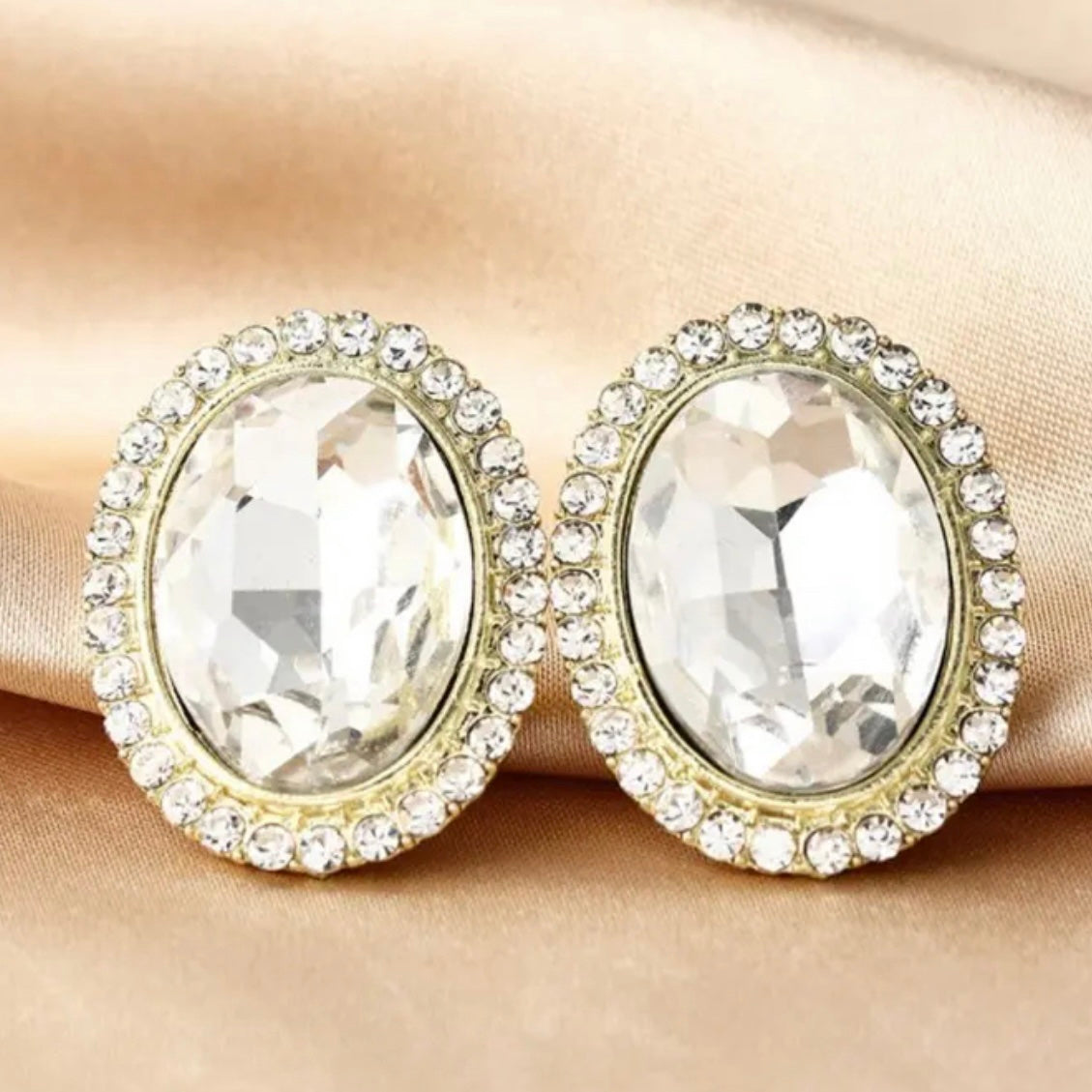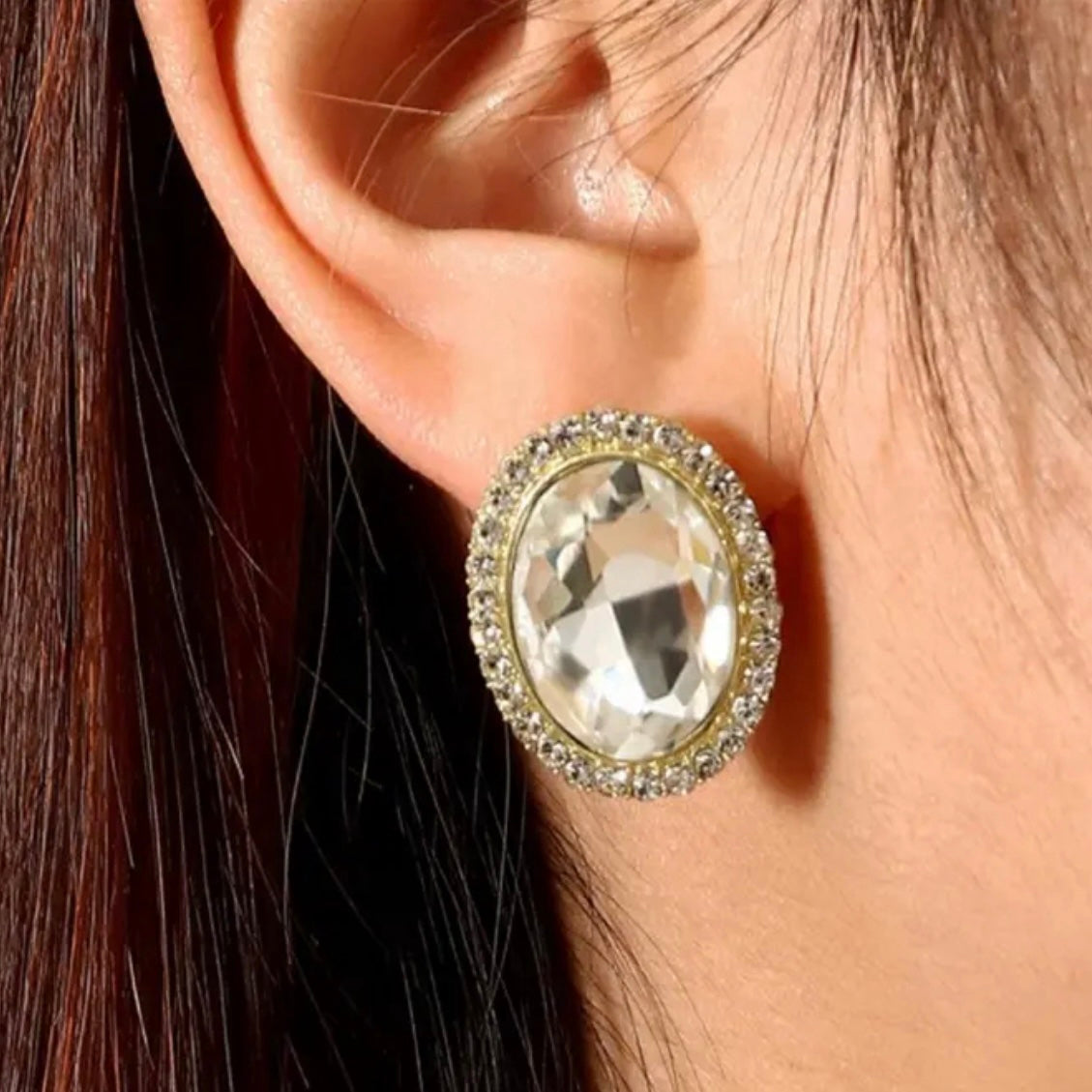 These vintage oval stud earrings feature a clear, transparent crystal that sparkles with elegance, encircled by a halo of shimmering rhinestones. The timeless design, set in a durable alloy, exudes a classic charm that complements any outfit. Perfect for adding a subtle yet sophisticated touch to both everyday looks and special occasions, these earrings are a versatile and stylish addition to your jewelry collection.