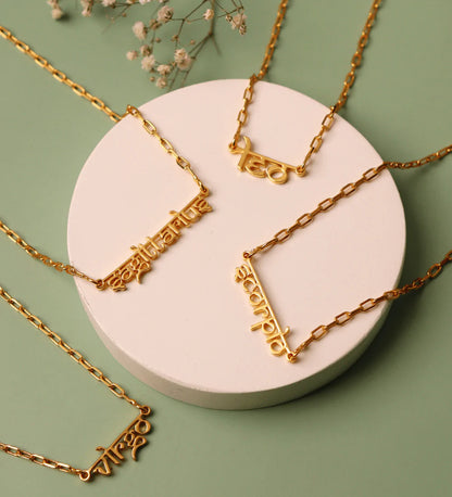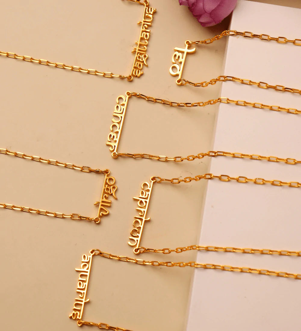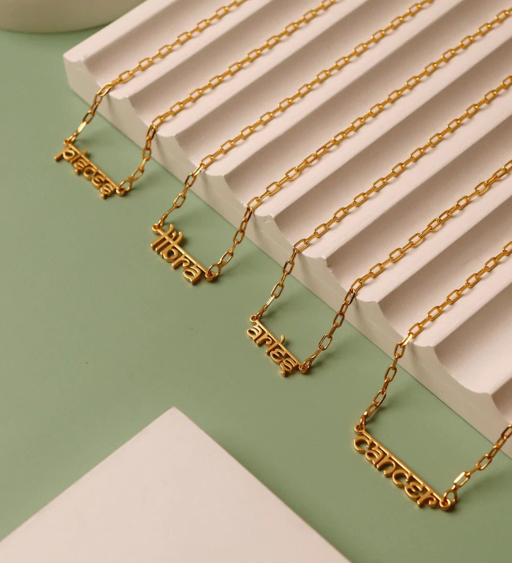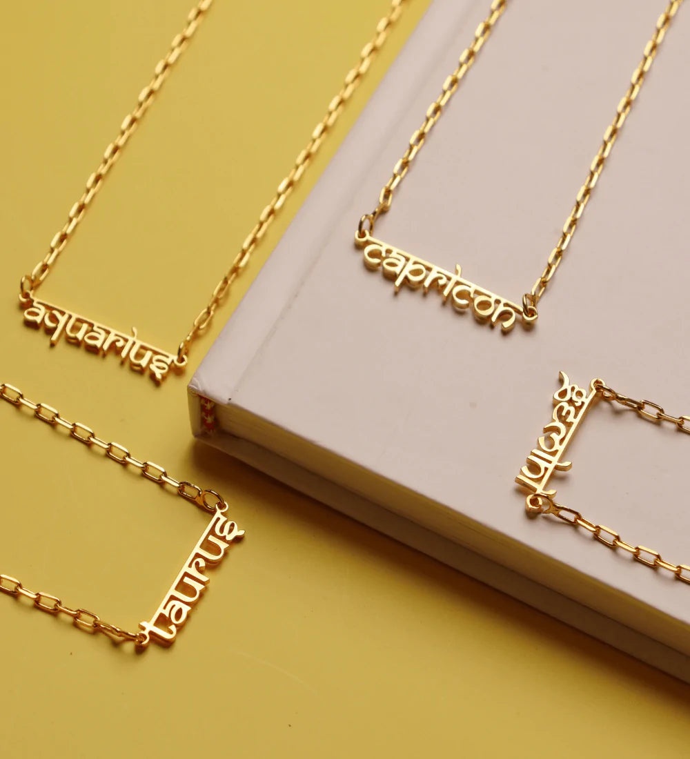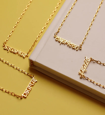 The necklace has the name of all the zodiac signs that dangles from the chain.